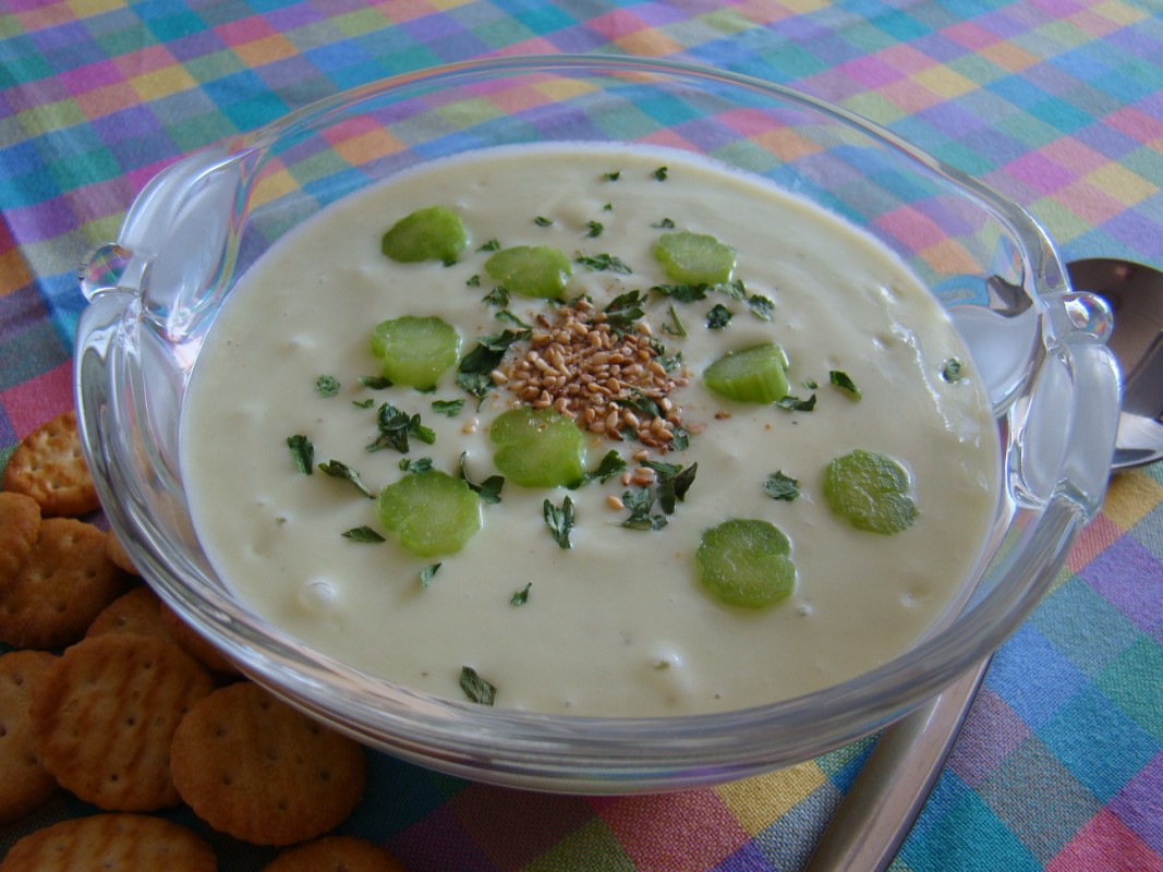 Tritura 2 aguacates, una rama de apio, tres yogures naturales, el zumo de medio limón, medio litro de caldo de verduras y un poco de sal y pimienta hasta hacer una crema suave. Puedes rectificar su espesor añadiendo más caldo. Empieza por medio litro y ve añadiendo si lo crees necesario hasta que adquiera el espesor que más te guste. Sirve bien fría con perejil picado, trocitos de apio y sésamo tostado.